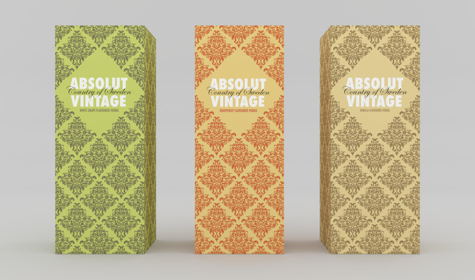 At the start of our last year in college, we were tasked with picking a brand of food or drink and designing a special edition with at least three variants.Due to their long-lasting reputation of bold design, exquisite photography, and collaborative work with illustrators, I chose ABSOLUT VODKA as my brand, picking Vintage as my special edition ( in truth, because I enjoy drawing pinups a lot ).However, I wanted to spice things up and give them a fresher look, thus I allied the visual idea of what is perceived as vintage with clean illustrations of today's "pinup girl" look, with tattoos, piercings, and undercuts.The boxes themselves were made to contrast, with a classic damask pattern, to reveal the cheeky surprise within.